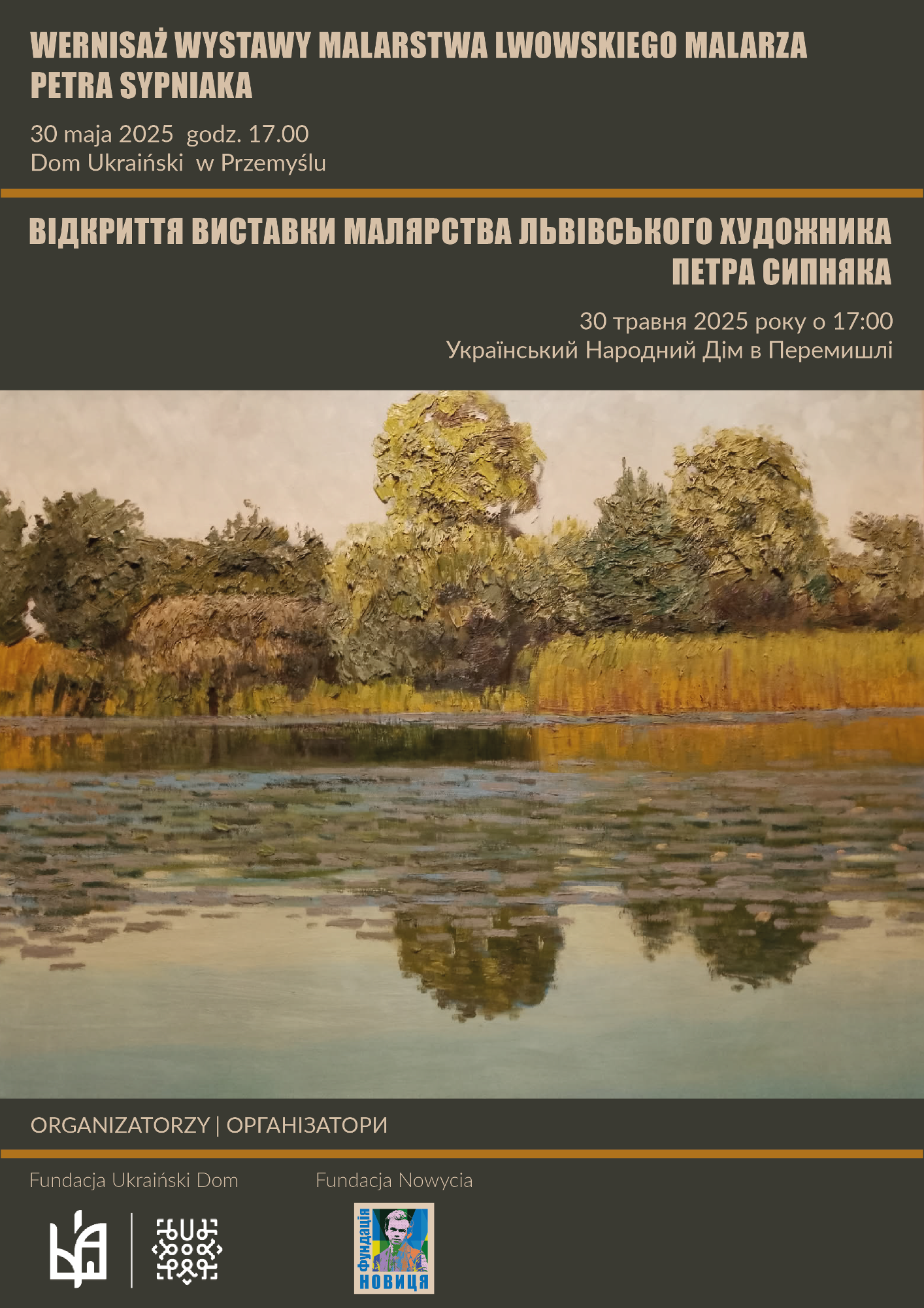 Виставка малярства Петра Сипняка організованою Фундацію Український дім i Фундацію Новиця буде відкриватись 30.05.2025 о 18:00 в Українському домі в Перемишлі.